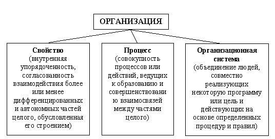 В нашем случае мы используем понятие «организация», в основном, в первом и во втором значении, то есть и как процесс (второе значение), и как результат этого процесса (первое значение). Третье значение также используется (но в меньшей степени) – при описании коллективной научной деятельности, управления проектами в организациях и т.д.