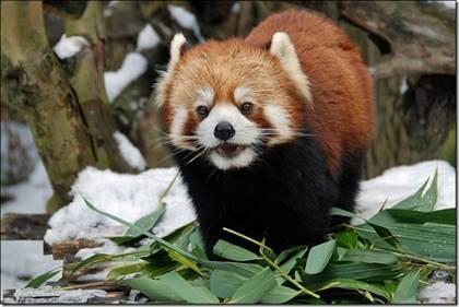 Kрасная панда (лат. Ailurus fulgens) — «кошка, окрашенная как огонь», также известная как малая панда, «кошка-медведь», «огненная кошка» — животное семейства малопандовых, в основном травоядное, размером немного крупнее кошки. Систематическое положение малой панды долгое время было неясно. Ее относили то к семейству енотовых, то к медвежьим, то выделяли в отдельное семейство. Однако последние генетические исследования показали, что малая панда образует собственное семейство малопандовых (Ailluridae), которое вместе с семействами енотовых, скунсовых и куньих образует надсемейство куницеподобных (Musteloidea). Длина тела 51—64 см, хвоста 28—48 см, весит 3—4,5 кг. Туловище удлинённое, хвост пушистый, голова широкая, с короткой острой мордочкой и большими заострёнными ушами. Имеет 38 зубов. Лапы короткие, крепкие, с полувтяжными когтями. Сверху шерсть малой панды рыжая или ореховая, снизу тёмная, рыжевато-коричневая или чёрная. У волос на спине жёлтые кончики. Лапы глянцевито-чёрные, хвост рыжий, с малозаметными более светлыми узкими кольцами, голова светлая, причём края ушей и мордочка почти белые, а около глаз рисунок в виде маски. По своему внешнему виду малая панда ближе всего к кинкажу. Письменные упоминания об этом звере в Китае восходят к XIII столетию, но европейцы узнали о нем только в XIX в. Официально «открыл» его в 1821 г. английский генерал и натуралист Томас Хардвик, собиравший материал на территории английских колоний. Он предложил называть это животное словом «хха» (wha) — одним из его китайских названий, основанном на имитации издаваемых зверьком звуков. Кроме того, сообщил генерал, китайцы называют его «хан-хо» (hun-ho) и «пунья» (poonya), от которого и произошло современное панда (panda). Однако латинское название — Ailurus fulgens (блистающая кошка), новому животному дал французский натуралист Фредерик Кювье. Ареал малой панды ограничен провинциями Юньнань и Сычуань в Китае, севером Бирмы, Бутаном, Непалом и северо-востоком Индии. Западнее Непала она не встречается. Живет в горных бамбуковых лесах на высоте 2000—4000 м над уровнем моря в условиях умеренного климата. Предки нынешних панд были распространены намного шире; их останки находят и в Восточной Европе, и в Северной Америке.