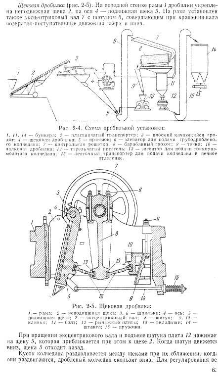 Первичное дробление кускового колчедана проводиться в щековых дробилках. В тех случаях, когда щековые дробилки не могут обеспечить требуемой производительности, применяют конусные дробилки для крупного и среднего дробления. Для более мелкого дробления колчедана до 5-6 мм, с последующим обжигом его в механический печах, устанавливают валковые дробилки с гладкими волками.
