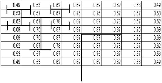 Графически распределение амплитуды тока по элементам ФАР можно представить следующим образом. Ток элемента с индексом p,q определяется формулой в [3]: