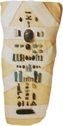 Амулеты (например око Хора, скарабей, сердце) служили магической защитой мумии.