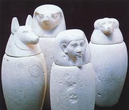 Крышки канопов исполнены в виде голов шакала, сокола, человека и павиана - божеств-защитников и сыновей Хора.