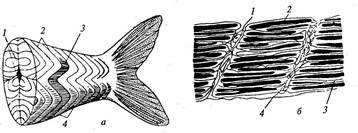 – поперечный разрез: 1 – продольные септы; 2 – поперечные септы (миосепты); 3 – мышечные волокна (направление их показано штрихами); 4 – миотомы; б