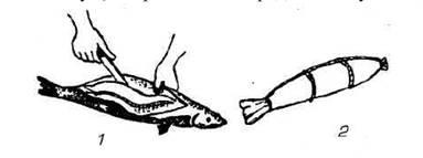 Для фарширования судака (рис. 5) целиком его очищают от чешуи, стараясь не повредить кожу. Затем отрубают плавники, делают глубокие надрезы на спине, прорезая реберные кости вдоль позвоночника с двух его сторон. После этого надламывают или перерезают позвоночник у хвоста и головы и удаляют его. Таким образом, в спине рыбы образуется отверстие от головы до хвоста, через которое удаляют внутренности. Рыбу хорошо промывают. Тонким ножом срезают мякоть и реберные кости, оставляя на коже слой мякоти не более 0,5 см. Плавники и кости внутри рыбы вырезают ножницами. Из головы рыбы удаляют глаза и жабры. Тщательно промытую рыбу наполняют фаршем, заворачивают в чистую марлю, перевязывают шпагатом и направляют на тепловую обработку.