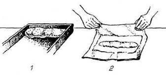 Рулет (рис. 9). Котлетную массу раскладывают на мокрую ткань или целлофан в виде прямоугольника слоем 1,5 – 2 см. На середину прямоугольника в продольном направлении помещают фарш и, приподнимая концы, соединяют края котлетной массой. Рулет перекладывают на смазанный маслом противень швом вниз, смачивают в льезоне, посыпают сухарями, сбрызгивают маслом и делают несколько проколов, чтобы образующиеся при тепловой обработке пары не разорвали оболочку.