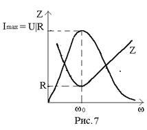 График зависимости тока от частоты противоположен графику зависимости полного сопротивления от частоты. На низких ( ) и высоких ( ) частотах , а ; на частоте полное сопротивление цепи для переменного тока является чисто активным и равно , а ток на данной частоте максимален и равен .
