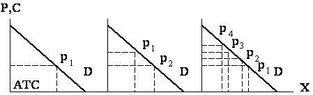 В левой части графика изображен обычный монополист, продающий товар по единой установленной им цене. В серединной части изображен монополист, которому удается взимать две различные цены с двух разных категорий покупателей. Это становится возможным потому, что при отрицательном наклоне кривой рыночного спроса разные группы покупателей готовы покупать единицу одного и того же товара по разным ценам. В правой части графика фигурируют уже четыре такие цены. Нетрудно видеть, что чем больше таких различных цен, тем большую прибыль получит дискриминирующий монополист.