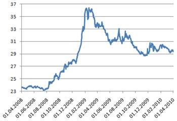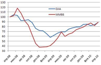 3. Российский фондовый индекс ММВБ в сравнении c американским индексом DJIA. В процентах от значений апреля 2008 года
