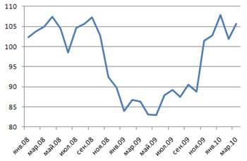 5. Индекс промышленного производства в России в 2008-2010 годах, в процентах к соответствующему периоду предыдущего года