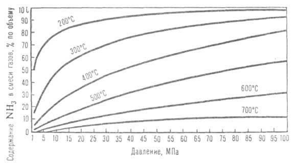. Сдвигу равновесия вправо способствуют повышение давления и понижение т-ры (см. рис. 2). Тепловой эффект р-ции при 29,4 МПа составляет 52,38 кДж/моль при 500°С и 51,29 кДж/моль при 400°С (с учетом теплоты смешениягазов). Процесс проводят в присут. кат.- Fe, активированного К2