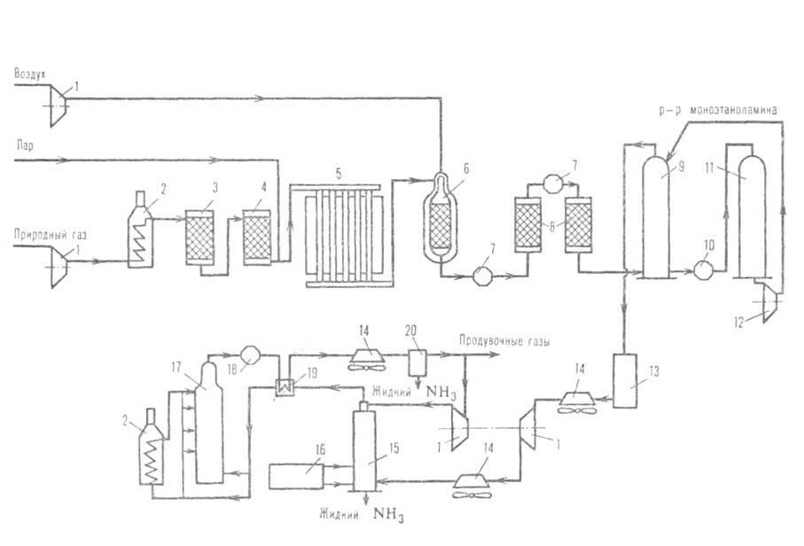 ; 14-воздушные холодильники; 15-конденсац. колонна; 16-испаритель жидкого NH3