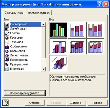 Работа с Мастером диаграмм состоит из четырех шагов. Рассмотрим 1й шаг построения нашей диаграммы. На первом шаге производят выбор типа и вида диаграммы.