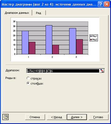 Если диапазон был выделен до того, как был вызван Мастер диаграмм, то в открывшемся окне можно увидеть диаграмму, соответствующую выделенным данным. Если диапазон не был выделен, то задать его можно в поле Диапазон (кнопка позволяет свернуть окно). Скорректировать диапазон отображаемых данных можно на вкладке Ряд.