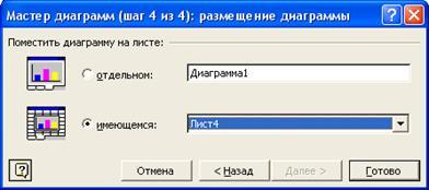 На последнем, четвертом шаге, определяют, где будет размещаться диаграмма: на отдельном листе или на уже имеющемся.