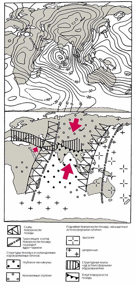 Рельеф геоида (геометрически сложной поверхности равных значений потенциала силы тяжести) дает хорошую подсказку в решении этой проблемы. В Азиатско-Индоокеанском регионе выделяется обширная полоса понижений поверхности геоида до отрицательных значений, с самым глубоким на Земле минимумом (–112 м) южнее Индостанского п-ова и о.Шри-Ланка. Этот сектор геоида с востока и запада ограничен протяженными и встречно-наклонными скатами, которые (судя по результатам глобальной сейсмической томографии) представляют собой крупные линеаменты, проникающие на глубину вплоть до раздела ядро—мантия. Само Азиатско-Индоокеанское понижение поверхности геоида неоднородно и распадается на две крупные части: Индоокеанский минимум и Азиатскую пониженную ступень. Они разделены невысоким уступом-скатом вдоль Гималаев и структурным мысом в районе Тибета. Возможно, Гималайский уступ поверхности геоида также транслируется на глубину до границы ядро—мантия, но относительно субширотного линеамента смещается на север на расстояние, эквивалентное двум третям протяженности Индостанского п-ова. А сопровождающий его мыс — морфологическое отражение глубинной структуры под Тибетом.