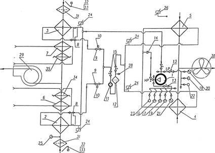 Установка кондиціонування повітря представляє собою підвісний горизонтальний автономний кондиціонер з рециркуляцією і складається із парокомпресійної холодильної машини, повітронагрівачів та вентиляційного обладнання. Пневмогідравлічна схема наведена на рисунку 1.1. В якості холодильного агента парокомпресійної холодильної машини використовується Хладон R134а (Фреон R134а) — озонобезпечне, нетоксичне, незаймисте індивідуальне хімічне з’єднання сімейства гідрофторвуглеводів (ГФВ): 1,1,1,2-тетрафторетан (хімічна формула CH2