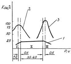 Вероятность безошибочного выполнения операций зависит от уровня работоспособности, и формулу (1) считают справедливой лишь для периода устойчивой работоспособности оператора, которая отличается значительным подъемом производительности труда после врабатывания в начале смены (рисунок 2). Динамика работоспособности характеризуется тремя основными фазами: I - врабатывание с возрастающей работоспособностью, II - устойчивая работоспособность и III - спад в связи с естественным утомлением (кривая 1). Незначительный спад наблюдается также приблизительно за 0,5 часа до обеденного перерыва, который в основном не связан с изменением работоспособности и поэтому на графике не учтен. [3]