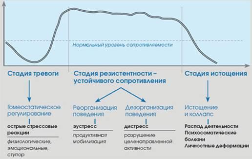 В то же время оба эти вида стресса имеют общую схему развития, включают в себя схожие нейрогуморальные механизмы адаптивных реакций и в своем развитии, как правило, проходят через три стадии-тревоги, адаптации и истощения.