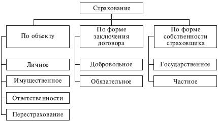 Страхование классифицируется по следующим признакам (рис. 1): по объекту, форме заключения договора страхования, форме собственности.