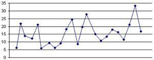 Интересным видом графика является график крестики-нолики (рисунок 1.3). Для этого графика не существует шкалы абсцисс. Это отличает крестики-нолики от всех других типов чартов. Важнейшей характеристикой графика крестики-нолики является то, что он рассматривает все сделки как один непрерывный поток и поэтому игнорирует фактор времени. На графике крестиков-ноликов движение цены обозначается либо крестиками, либо ноликами. Каждый символ на графике занимает одну клетку. Крестики обозначают растущую цену, а нолики — падающую.
