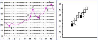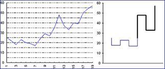Диаграммы Рэнко (рисунок 1.5). Название диаграммы происходит от японского слова "рэнгэ" - "кирпич" ("рэнко" - "кирпичик"). Рэнко представляет собой своеобразный синтез свечей и полосок с графиками типа "крестики-нолики". Задается базовое значение диаграммы, соответствующее размеру блока (высоте "кирпичика"). Построение ведется следующим образом. Если цена ушла вверх на такое расстояние от верхнего уровня последнего "кирпичика", в котором укладывается n базовых значений, то строится n белых "кирпичиков". Если же опустилась вниз на расстояние от нижнего уровня последнего "кирпичика", в котором укладывается n базовых значений, то строится цепочка из n черных "кирпичиков".