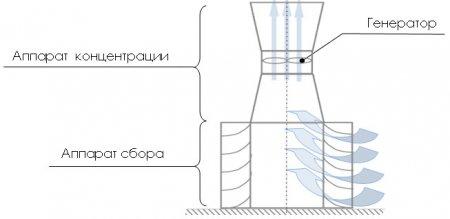 размещен внутри аппарата концентрации энергии. Генератор преобразует кинетическую энергию воздушного потока в электрическую энергию.
