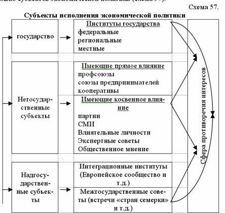 Экономическая политика – система целенаправленных мер государства в области управления экономикой. В обществе существует несколько субъектов экономической политики (схема 57).