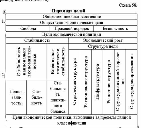 Для выработки экономической политики особое значение имеет выбор цели и соответствующей ей инструментов. К целям экономической политики предъявляются определенные требования. Во-первых, должны ставиться только те цели, реализацию которых не может обеспечить рынок. Во-вторых, цель должна быть количественно измерима, что даст возможность контролировать ее выполнение. В процессе реализации основных целей общество вынуждено решать множество разных задач, которые образуют иерархическую соподчиненность – «пирамиду целей» (схема 58).