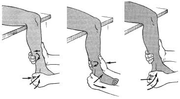 I. Вначале одной рукой хирург обхватывает пятку сзади и надавливает на нее книзу и вперед, другую руку кладет на переднюю поверхность голени, немного выше голеностопного сустава, и отдавливает голень назад. Одновременно с этим стопа максимально сгибается в голеностопном суставе в тыльном направлении. Таким образом, происходит низведение заднего края большеберцовой кости и вправление заднего вывиха стопы. В этом момент хирург ощущает, что задник вывих стопы вправился (рис. 196, I). II. Руку, которая обхватывает пятку, хирург передвигает на наружную поверхность голеностопного сустава и сильно надавливает снаружи внутрь; другой рукой обхватывает голень с внутренней стороны надлодыжечной области, создавая противодавление. В это время он ощущает, что под его руками вправился наружный подвывих стопы (рис. 196, II). После этого хирург кладет обе руки на область лодыжек и сжимает вилку голеностопного сустава. Одновременно гематому и отек отдавливают кверху.