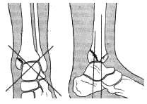повреждения синдесмоза. К достоверным признакам относят межберцовый диастаз при отсутствии суперпозиции берцовых костей и расширение щели синдесмоза более 6 мм. К вероятным признакам повреждения относятся; наружный подвывих стопы, укорочение наружной лодыжки, смешение малоберцовой кости по длине и ротационные смещения. При подозрении на повреждение дистального межберцового сочленения необходимо провести рентгенографическое исследование при специальной укладке конечности - фасную рентгенограмму проводят в положении внутренней ротации голени на 25-30°. Отсутствие суперпозиции берцовых костей на рентгенограмме - абсолютный признак повреждения дистального межберцового сочленения.