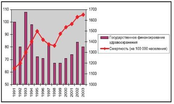 Рис. 4. Динамика государственного финансирования здравоохранения в реальном выражении и смертность населения РФ (уровень финансирования 1991г. принят за 100%).