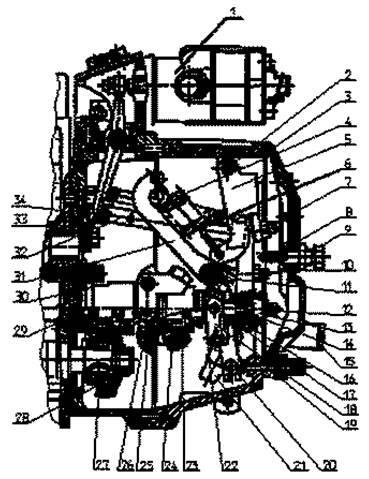 11 - вал рычага пружины; 12, 13, 14 – корректирующее устройство; 15 - скоба кулисы; 16 - втулка отрицательного корректора; 17 – рычаг регулятора;18 - рычаг отрицательного корректора; 19 - винт подрегулировки мощности; 20 - рычаг рейки; 21 - кулиса; 22 - пята;23 - муфта грузов; 24 - грузы регулятора; 25 - державка грузов; 26 - ось грузов; 27 - ведущая шестерня; 28 - сухари; 29 - валик державки грузов; 30 - стакан; 31 - рычаг пружины; 32 - тяга рейки; 33 - упор рычага пружины; 34 - рейка.