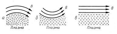 Представьте себе, что плазма, в которой совсем нет магнитного поля, удерживается в равновесии внешним магнитным полем. При этом возможны три случая конфигурации магнитного поля: линии индукции могут быть выпуклыми, вогнутыми или прямыми (рис. 13). Характер действия магнитного поля на проводящую жидкость (плазму) таков, как если бы он определялся стремлением линий индукции сокращаться подобно натянутым резиновым жгутам. Плазма же, как и всякий газ, стремится увеличить свой объем. Что же в результате получается, когда магнитные линии индукции выпуклы наружу (рис. 13, а)? Магнитное поле не проникает в плазму. Стремлению линий индукции сократиться мешает стремление плазмы увеличить свой объем. Но если только по каким-нибудь причинам магнитное поле освобождает часть занимаемого им пространства, плазма тотчас же туда устремляется. Наоборот, место, освобожденное плазмой, занимается магнитным полем. Магнитное поле и плазма обмениваются своими местами. Плазма как бы «раздвигает» линии индукции и просачивается через магнитное поле.