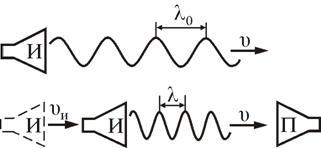 1) Пусть приемник звуковых волн П в газообразной (или жидкой) среде неподвижен относительно нее, а источник И удаляется от приемника со скоростью вдоль соединяющей их прямой (рис.2, а