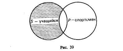 «спортсмен», квантор существования — «некоторые». Субъект не распределен, так как мыслится лишь часть учащихся, а предикат распределен, ибо в нем мыслятся все спортсмены, ни один из которых не включен в ту часть учащихся, которая мыслится в субъекте (рис. 39).