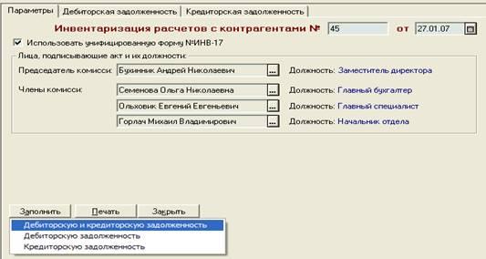 Для формирования произвольной формы необходимо снять флажок «Использовать унифицированную форму ИНВ-17». В реквизите «Тип задолженности» указать тип задолженности контрагентов, которую будет отражать отчет. Для выбора предлагается три варианта: дебиторская и кредиторская; дебиторская; кредиторская (рис.1).