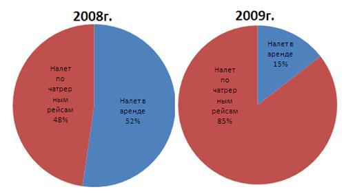 Несмотря на увеличение налета часов на чартерных рейсах на 50,8% (1 512 часов), доходы от выполнения чартерных рейсов увеличились на 21,4% (5 686 млн. руб.) относительно соответствующего периода прошлого года, т. к. доходная ставкасократилась на 38,9% (4 193$ в 2008г., 2 560$ в 2009г.).