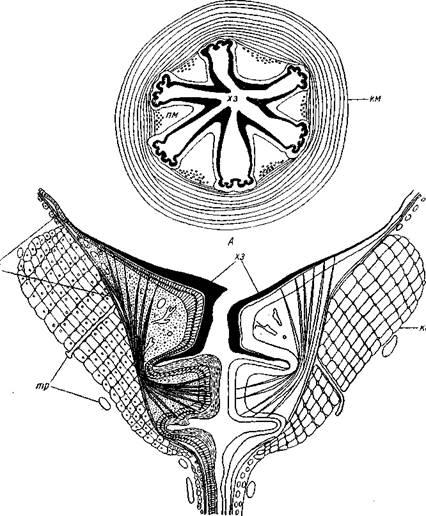 Под эпителием располагаются мышечные стенки, состоящие из внутреннего кольцевого и наружного продольного слоя.