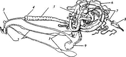-пищевод; 4-кардиальный клапан; 5-средняя кишка; 6-мальпигиевы сосуды; 7-тонкая кишка; 8