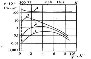 Рис. 2.2. Залежності питомої провідності германію п-типу від температури. Штриховою лінією показано власну провідність. Концентрація домішки миш'яку: 1 -