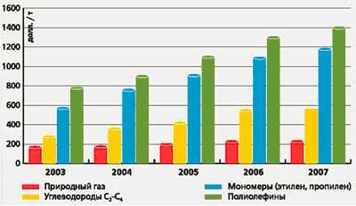 Например, стоимость полиэтилена низкой плотности и готовых изделий из него в 10-20 раз выше стоимости исходного сырья - этана. На рисунке 2 показано увеличение темпов роста рентабельности при производстве полиолефинов, обусловленное более высокими темпами роста цен на эту продукцию по сравнению с ростом цен на сырье.