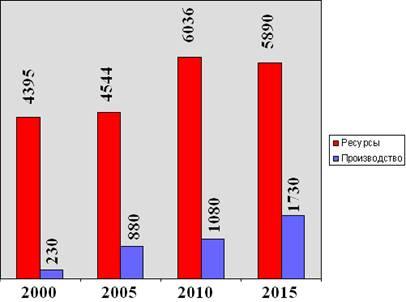 Рис.3. Ресурсы этана (тыс. т/год) в добываемых этансодержащих газах и его производство