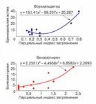 Рис. 3. Регрессионные модели и графические тренды зависимости детской заболеваемости от загрязнения атмосферного воздуха. По осям ординат отложено число случаев на 1000 детей
