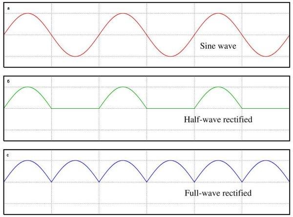 Рисунок 2. а) исходное напряжение (напряжение на входе), б) однополупериодное выпрямление, с) двухполупериодное выпрямление