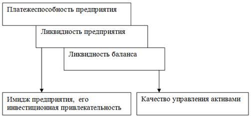 Понятия платежеспособности и ликвидности очень близки, но второе более емкое. От степени ликвидности баланса зависит платежеспособность. В то же время ликвидность характеризует как текущее состояние расчетов, так и перспективу. Предприятие может быть платежеспособным на отчетную дату, но иметь неблагоприятные возможности в будущем. На рис.1 показана блок-схема, отражающая взаимосвязь между платежеспособностью, ликвидностью предприятия и ликвидностью баланса, которую можно сравнить с многоэтажным зданием, где все этажи равнозначны, но второй этаж нельзя возвести без первого, а третий без первого и второго. Если рухнет первый, то и все остальные развалятся. Следовательно, ликвидность баланса является основой (фундаментом) платежеспособности и ликвидности предприятия. Иными словами, ликвидность — это способ поддержания платежеспособности. Но в то же время, если предприятие имеет высокий имидж и постоянно является платежеспособным, то ему легче поддерживать свою ликвидность.
