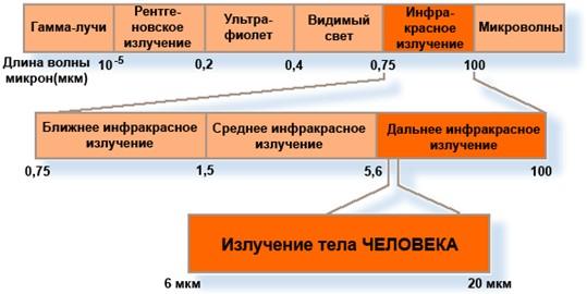 Инфракрасное излучение также называют «тепловым» излучением, так как инфракрасное излучение от нагретых предметов воспринимается кожей человека как ощущение тепла. При этом длины волн, излучаемые телом, зависят от температуры нагревания: чем выше температура, тем короче длина волны и выше интенсивность излучения.