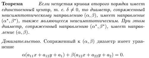 Если один из двух диаметров эллипса или гиперболы делит пополам хорды, параллельные другому, то второй диаметр делит пополам хорды, параллельные первому. Такие два диаметра называются взаимно сопряжёнными.