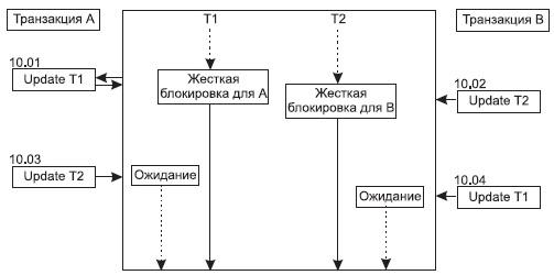 К сожалению, применения разных типов блокировок приводит к проблеме тупиков. Эта проблема не нова. Проблема тупиков возникла при рассмотрении выполнения параллельных процессов в операционных средах и также была связана с управлением разделяемыми (совместно используемыми) ресурсами. Действительно, рассмотрим пример. Пусть транзакция А сначала жестко блокирует таблицу 1, а потом жестко блокирует таблицу 2. Транзакция B, наоборот, сначала жестко блокирует таблицу 2, а потом жестко блокирует таблицу 1. Если обе эти транзакции начали работу одновременно, то после выполнения операций модификации первыми объектами каждой транзакции они обе окажутся в бесконечном ожидании: транзакция А будет ждать завершения работы транзакции B и разблокировки таблицы 2, а транзакция В также безрезультатно будет ждать окончания работы транзакции А и разблокировки таблицы 1 (Рисунок 7).  Рисунок 7 - Взаимная блокировка транзакций
