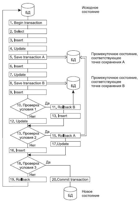 IF EXISTS (SELECT titles.title, roysched.royalty FROM titles, roysched WHERE titles.title_id = roysched.title_id AND roysched.royalty = 15) --Нет ни одной строки. BEGIN UPDATE roysched SET royalty = 20 WHERE royalty = 15 COMMIT TRAN update_royalty END ELSE --Выполняется ROLLBACK. ROLLBACK TRAN update_royalty GO В этой транзакции первый оператор IF EXISTS (SELECT...) определяет, что существует несколько строк, и поэтому оператор UPDATE выполняется (показывая, что модификация касается 13 строк). Второй оператор SELECT возвращает 0 строк, и поэтому второй оператор UPDATE не выполняется, но выполняется оператор ROLLBACK TRAN update_royalty. Поскольку ROLLBACK выполняет откат всех модификаций до самого начала данной транзакции, то происходит откат первой модификации. Если снова выполнить первый оператор SELECT, то по-прежнему будут 13 строк со значением royalty, равным 16, как и было в исходном состоянии базы данных, когда запускали данную транзакцию. И снова изменение royalty на значение 17 будет отменено (будет выполнен откат) из-за оператора ROLLBACK. Откат транзакции нельзя выполнить после ее фиксирования. Чтобы можно было выполнить явный откат отдельной транзакции, оператор ROLLBACK должен предшествовать оператору COMMIT. В случае вложенных транзакций после фиксирования внешней транзакции (и, тем самым, внутренних транзакций) уже нельзя выполнить откат ни одной из транзакций. Нельзя выполнить откат только внутренних транзакций; должен быть выполнен откат всей транзакции (всех внутренних транзакций и внешней транзакции). Поэтому, включив имя транзакции в оператор ROLLBACK, проследите за тем, чтобы было указано имя внешней транзакции (во избежание путаницы и сообщения об ошибке от SQL Server). Однако существует обходной путь, позволяющий избежать отката всей транзакции и сохранить часть модификаций: можно использовать точки сохранения. 2.4.3 Точки сохранения