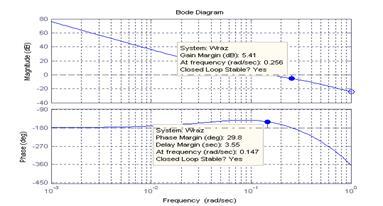 Из диаграммы Боде (рис.3) видно, что замкнутая система обладает робастностью, т.е. достаточной устойчивостью как по фазе - 29,8о